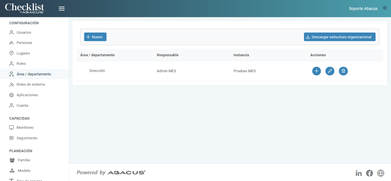 10.0.0 Área / Departamento En este apartado veremos la lista desplegable de las áreas / departamentos del sistema y podremos descargar la estructura organizacional.