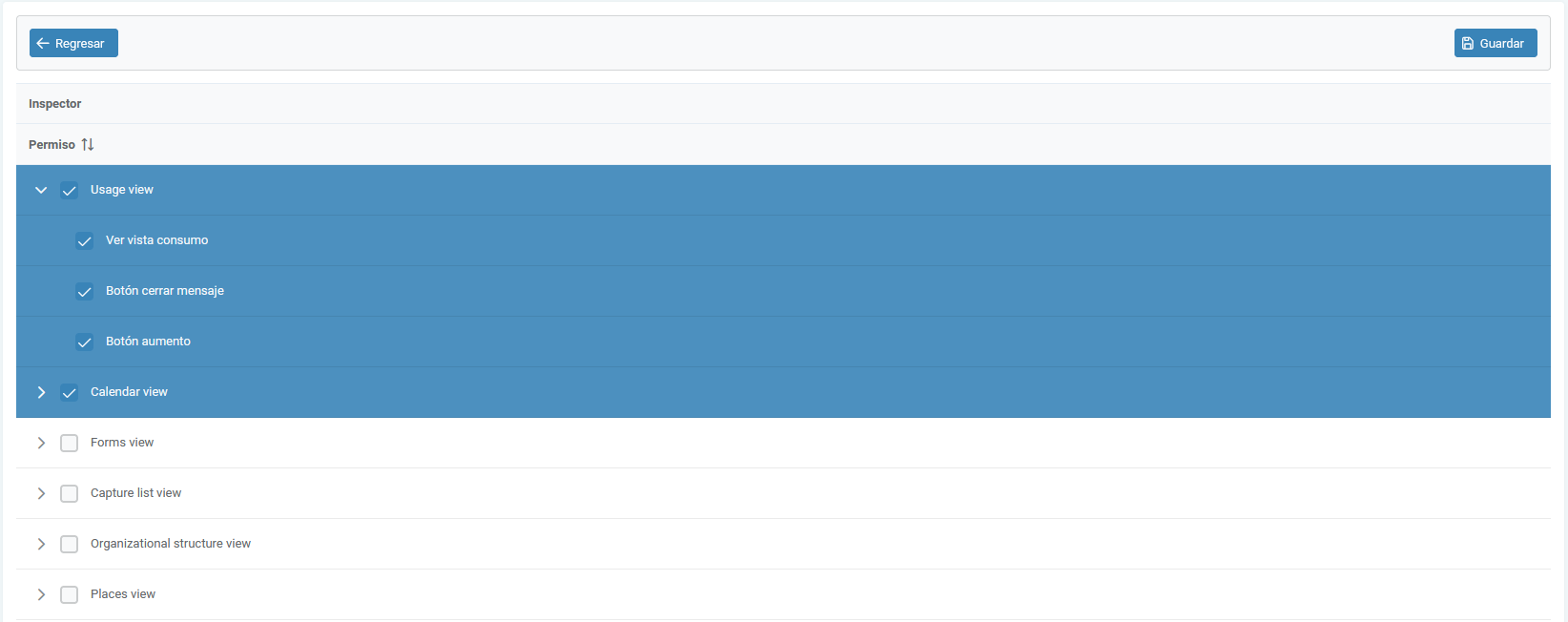 Nos mandará a una nueva vista en donde tendremos listas desplegables con los permisos disponibles a asignarle al rol, marcaremos las casillas de los permisos que queramos para el rol y daremos click en Guardar.
