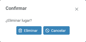 8.0.0 Lugares 8.2.0 Eliminar lugar Esta opción permite eliminar un lugar del sistema. Se desplegará una ventana modal en donde confirmaremos si deseamos eliminar el lugar, esta acción solo se podrá realizar si dicho lugar no está asignado a alguna persona o un formulario activo.